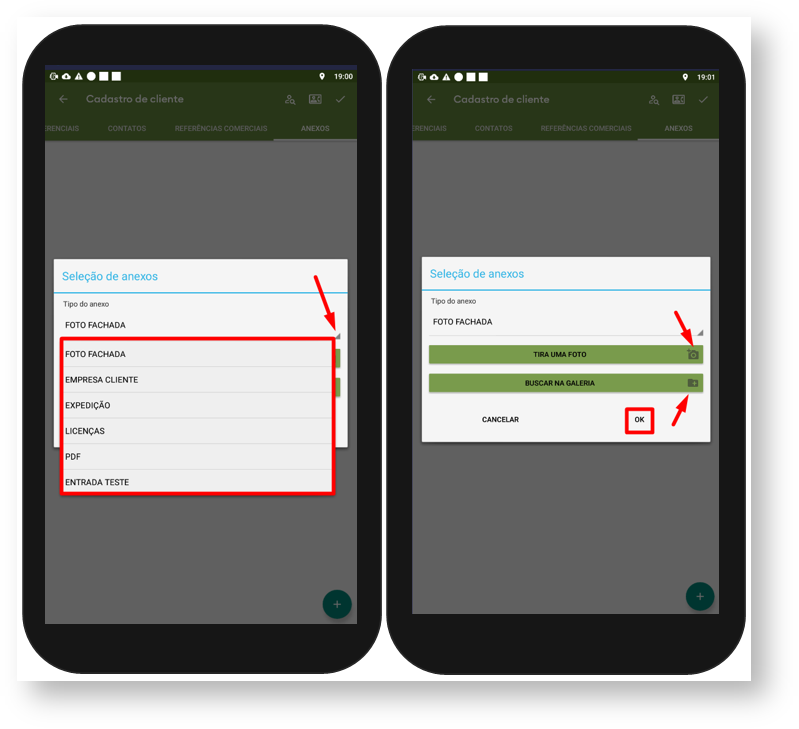3.2 Selecione o tipo de anexo, ele poderá ser incluído através da opção de Tirar uma foto, onde será aberta a câmera do aparelho ou pela opção de Buscar na Galeria, que abrirá a galeria do aparelho para selecionar imagem para anexar, clique em ok para prosseguir.