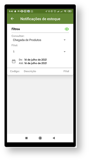 2.0  Na opção de Notificação de Estoque poderá ser pesquisado as notificações de Chegada de Mercadoria e Término de mercadoria, essa notificação é envida pelo ERP. Selecione o tipo de notificação, a filial e a data de inicio e fim ( De: / Até:), que será impresso na tela as notificações recebidas.