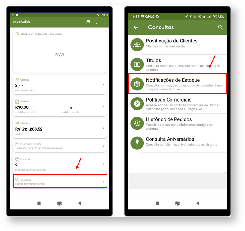 1.0 Ao acessar o aplicativo do maxPedido clique na aba Consultas e depois em Notificação de Estoque.