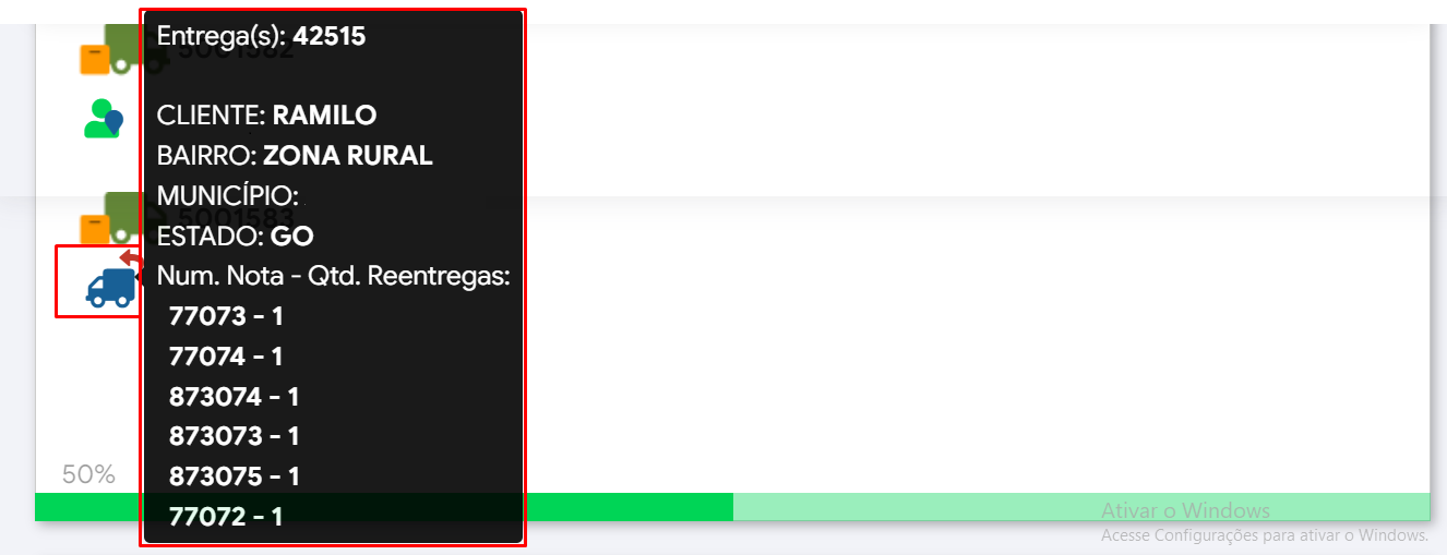 • Ao selecionar a opção “Expandir Cards” será possível visualizar as entregas sinalizadas e a quantidade de vezes que a entrega foi marcada como "reentrega":