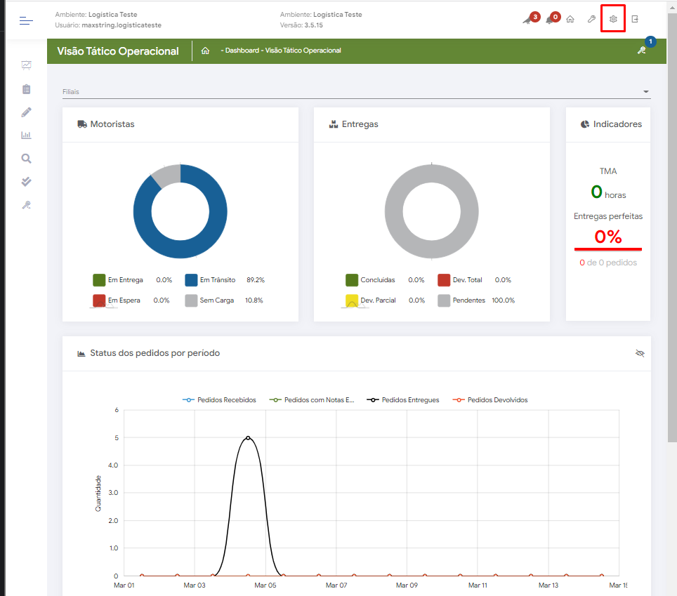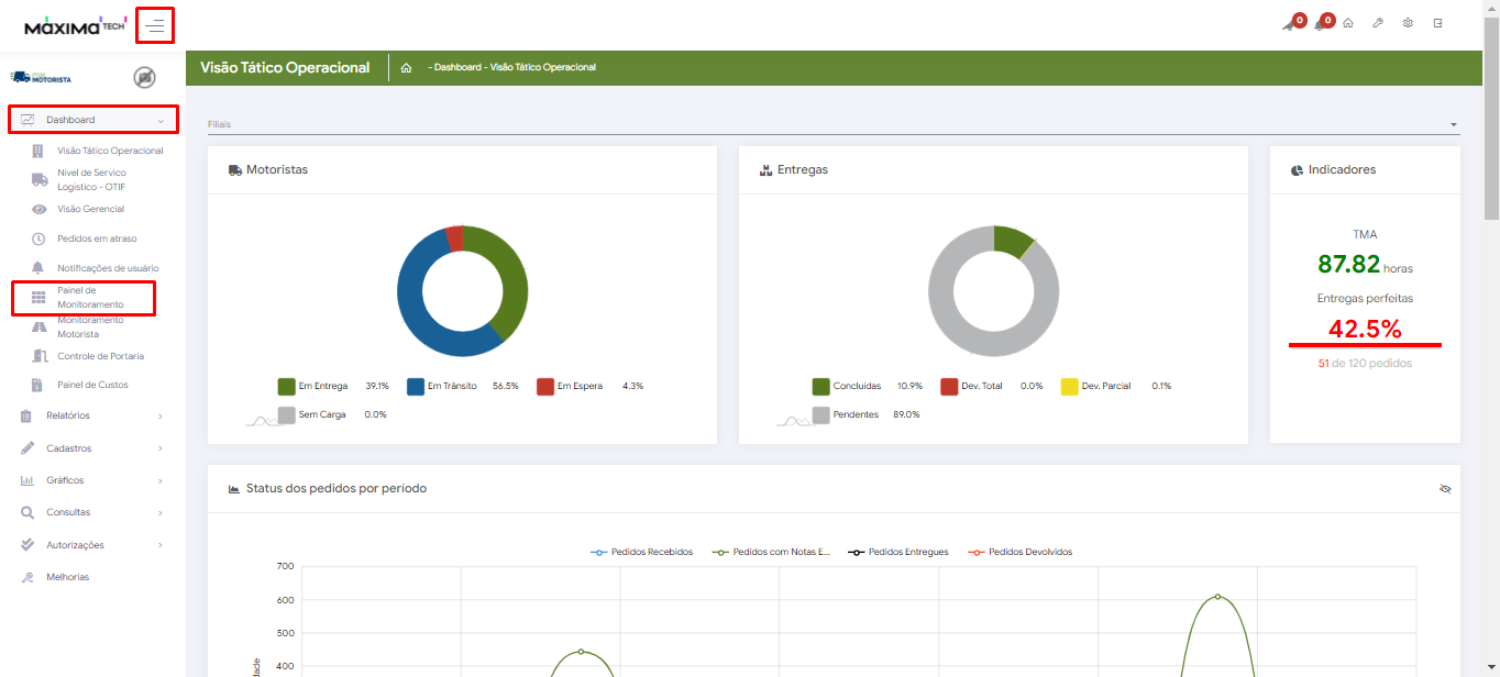 Ao lado esquerdo da tela temos um MENU que permite filtrar as reentregas por data e motorista: