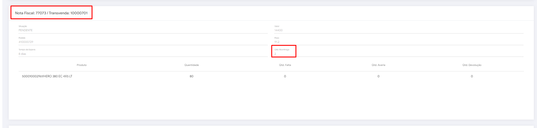 Ao marcar a entrega como “Reentrega” todas as NFs vinculadas a essa entrega contabilizarão +1 na tabela para quantificar as vezes que a NF da entrega foi marcada para ser reentregue.