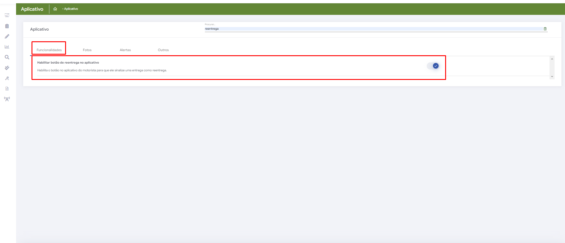 • Na aba Funcionalidades, habilitar o parâmetro "Habilitar Reagendamento da Entrega via Aplicativo".