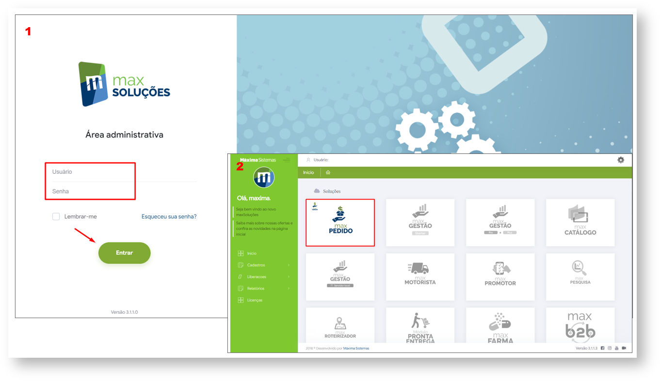 1.1 Com usuário e senha acesse o maxSoluções(1) e selecione o maxPedido(2).