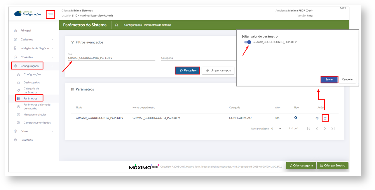 3- Clique no ícone de edição da Coluna Ações e habilite o parâmetro, clique em salvar.