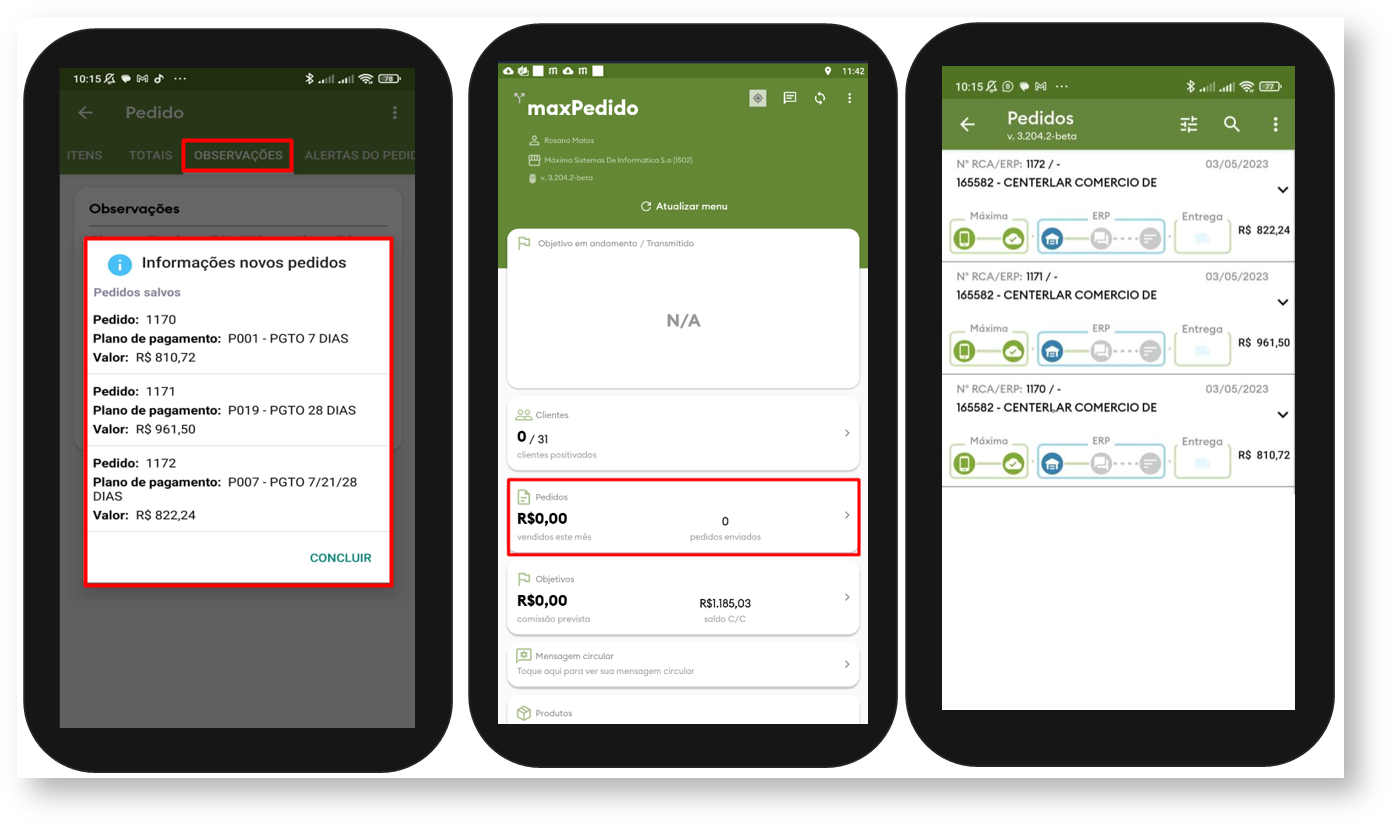2.3 Ao salvar o pedido, será realizado desmembramento gerando pedidos de acordo com os planos de pagamento escolhidos, ou seja, para cada cada plano de pagamento selecionado será gerado um número de Pedido. Ao enviar o pedido será exibido ao vendedor uma mensagem (Quando possuir mais de um plano de pagamento o pedido será desmembrado de acordo com cada plano) onde é possível visualizar as informações dos novos pedidos gerados , como os números, planos de pagamento e o valores de cada um. Para acompanhar esses novos pedidos basta acessar o card de Pedidos na tela inicial do Aplicativo, conforme imagens abaixo.