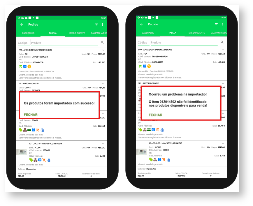 5- Clique em importar para que o aplicativo possa realizar a importação dos produtos do arquivo Excel para o pedido no aplicativo.