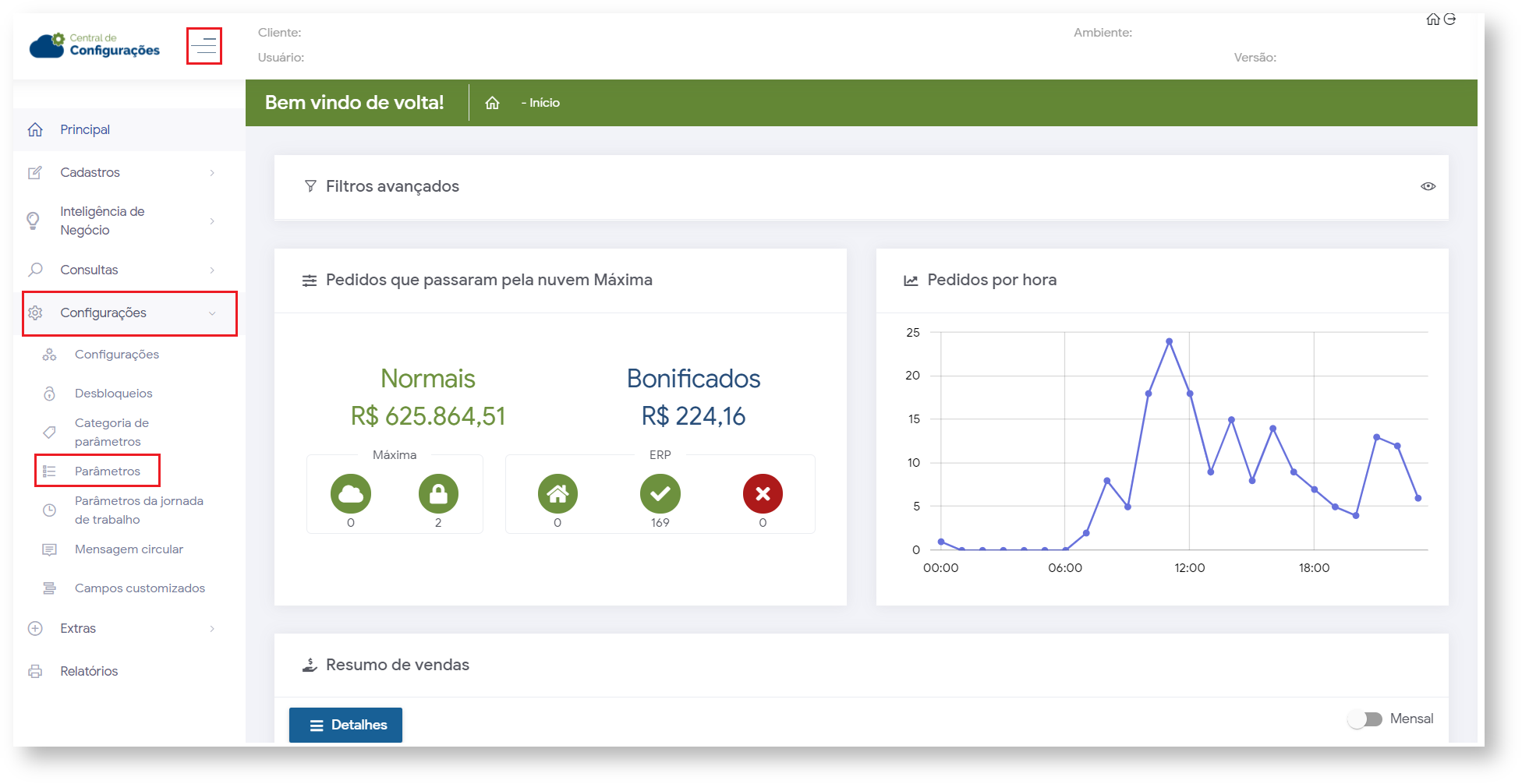 3 No canto superior esquerdo no ícone  clique em configurações e depois em parâmetros.