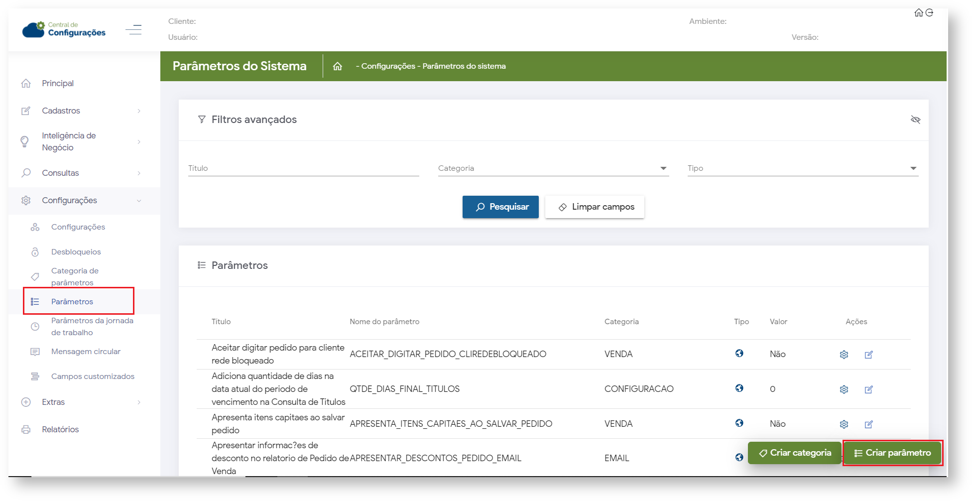 4 Após entrar na parte de parâmetros, no canto inferior direito clique em criar parâmetro