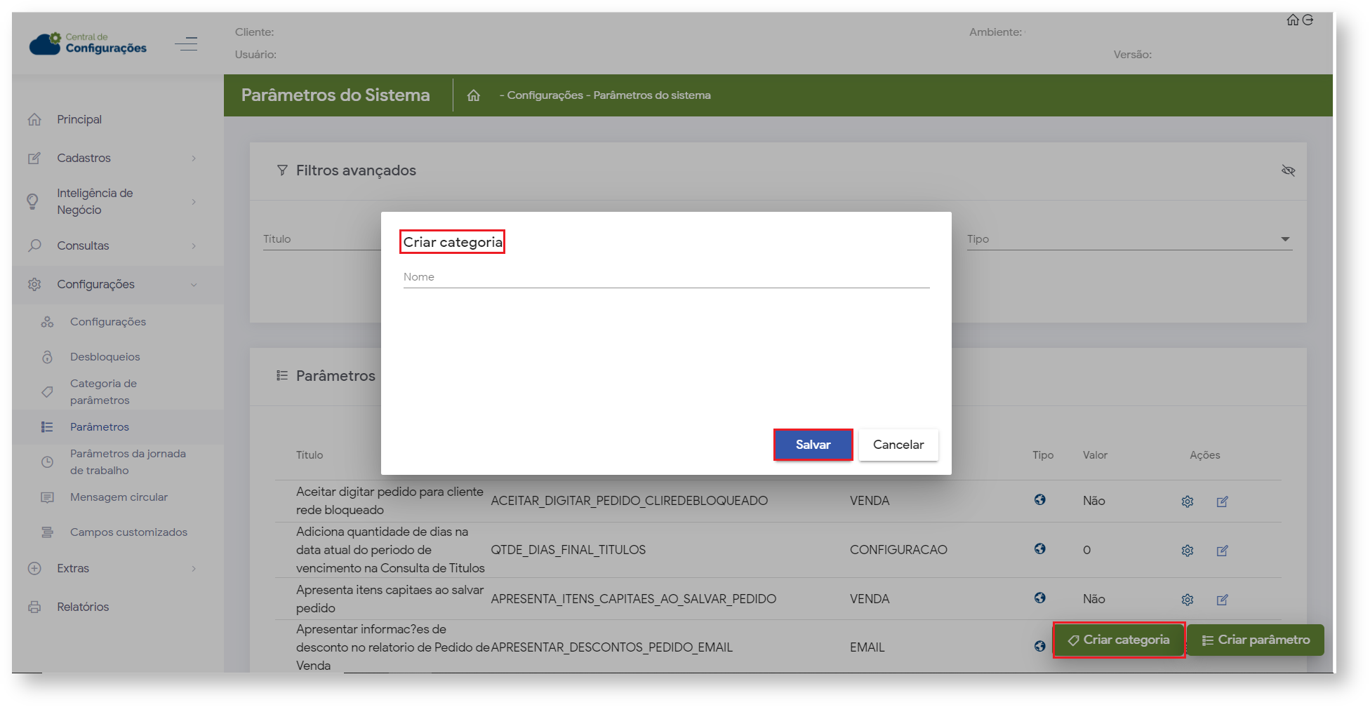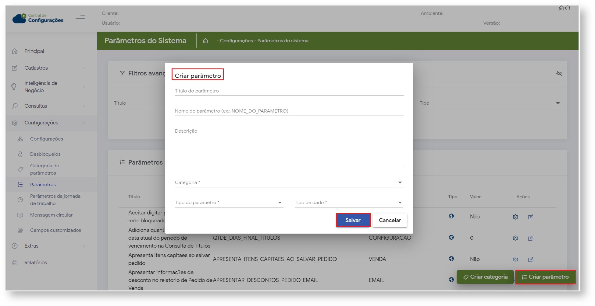 5 Preencha as informações solicitadas para criação do parâmetro.