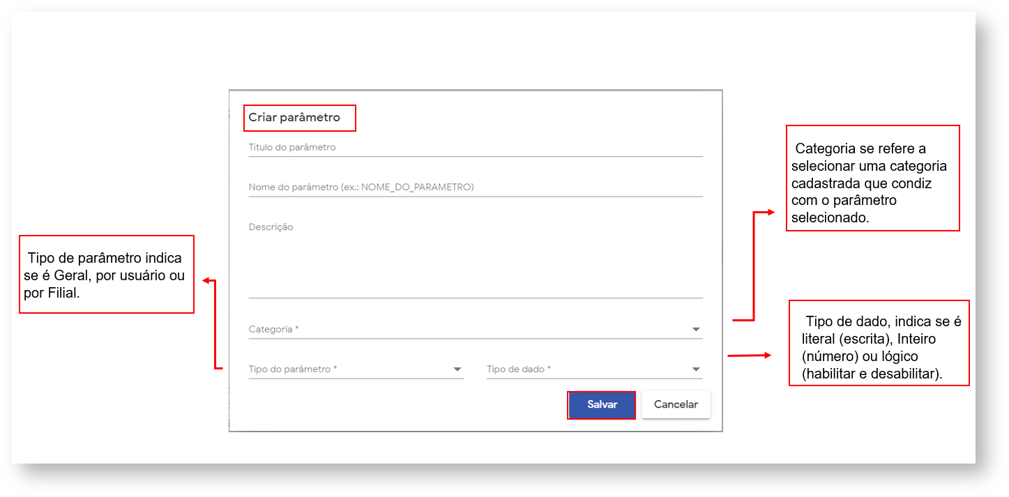 6 Além do nome do parâmetro e sua descrição se atente ao tipo do parâmetro e tipo de dado, quanto a categoria não existe uma restrição de seleção. Segue abaixo ilustração para melhor entendimento.