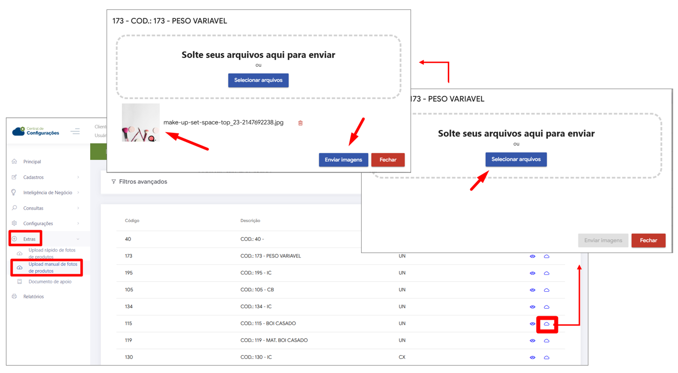 1- Na Central de Configurações, clique no menu lateral> Extras> Upload rápido de fotos de produtos